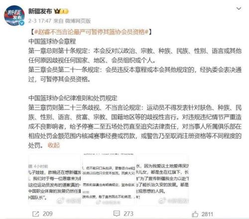 另外“新疆發布”還轉載了中國籃球協會章程,以及中國籃球協會紀律準則和處罰規定。其內容明確表示任何球員不得有以下這些行為或不當言論,會員違反本章程或本會規定的,經執委會表決通過,可暫停其會員資格。對於造成不良影響的球員,可以處禁賽2-5場的處罰,情節較為嚴重的可以追究其法律責任,對於球員所在的俱樂部也會有相應的罰款或者是核減經費,嚴重的甚至會取消其注冊資格等。