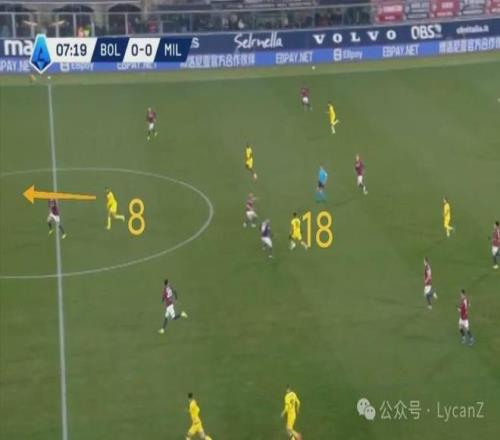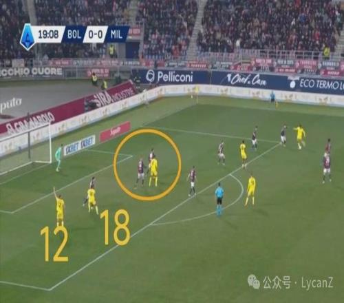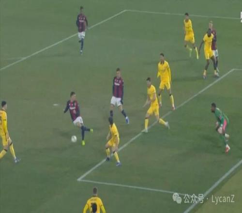 10′10″,博洛尼亞逼搶前場完成斷球,直接形成4V4麵對米蘭後衛,在弧頂機會和下底選擇中,羅維選擇自己單幹,突入禁區也晃開了加比亞重心,受到推搡但沒有吹罰。