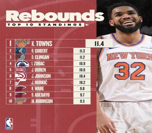 紐約:唐斯第1(11.4) + 米切爾·羅賓遜第10(9.3),說明他們的籃板產量不是靠某一位“獨扛”,而是雙點並行。