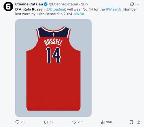 一天之前,球衣號碼博主透露,丹吉洛-拉塞爾在奇才的球衣號碼是14號,上一位在奇才穿14號球衣的是伯納德。