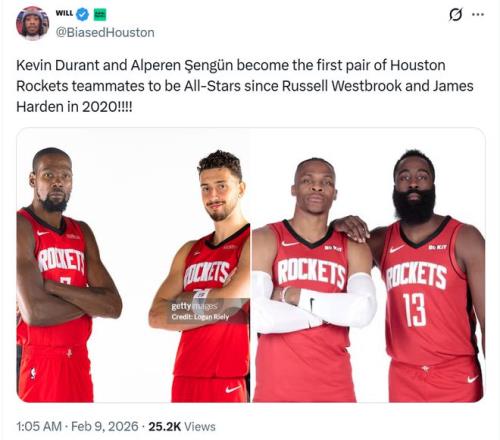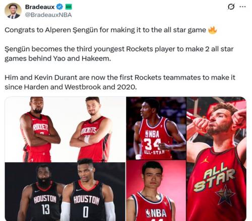 紀錄四:加上此前杜蘭特已經入選,讓杜蘭特與申京成為火箭隊史自2020年哈登和威少以來首次同時入選全明星的隊友。