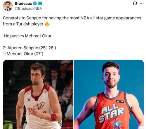 紀錄一:這是申京生涯第二次入選全明星,成功超過同胞奧庫成為入選全明星次數最多的土耳其球員。