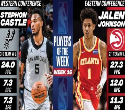 NBA官方公布了第16周的東西部周最佳球員,東部由老鷹前鋒傑倫約翰遜當選,西部由馬刺後衛卡斯爾當選。傑倫約翰遜上周場均豪取27.3分+12籃板+11.3助攻,帶領老鷹取得2勝1負的戰績。據統計,這是傑倫約翰遜本賽季第2次拿到周最佳球員獎。卡斯爾上周場均貢獻24分+7.3籃板+7.3助攻,帶領馬刺隊取得3勝0負的戰績。據統計,這是卡斯爾生涯首次獲得該獎項。除此之外,猛龍隊的巴恩斯、尼克斯隊的布倫森和唐斯、76人隊的大帝和馬克西、騎士隊的米切爾、雄鹿隊的羅林斯、開拓者隊的克林根和格蘭特、快船隊的小卡、鵜鶘隊的墨菲和馬刺隊的文班亞馬等球星獲得了周最佳提名。