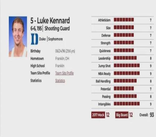NBA選秀網站綜合評分93分,預計選秀順位12順位,實際選秀順位12順位,選秀模板:尼克-斯陶斯卡斯/傑夫-霍納塞克.