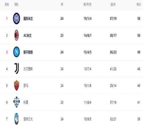 榜首位置依舊被國際米蘭牢牢占據,他們目前以58分的積分領跑積分榜,戰績為19勝1平4負,優勢十分明顯。或許有球迷會疑惑,國際米蘭輸球的場次並不算少,為什麽還能穩居榜首?核心原因就在於他們的平局極少,贏球的場次是目前聯賽中最多的,憑借著超高的贏球效率,成功穩住了榜首位置,牢牢掌握著爭冠主動權。