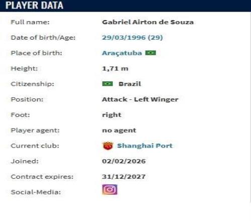 德轉顯示,加布裏埃爾與上海海港簽署了一份為期2年的合同。