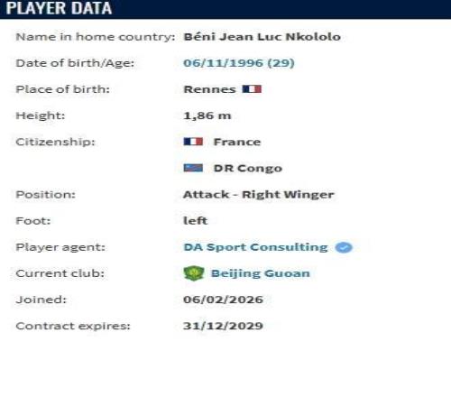 德轉顯示,恩科洛洛與北京國安簽署了一份為期4年的合同。