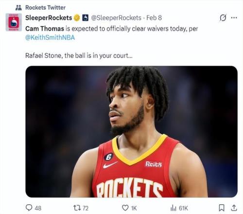 實際上在托馬斯被籃網裁掉後,休斯頓火箭隊也是他的潛在下家之一,而火箭距離硬帽隻有125萬,火箭最高隻能開出125萬的底薪,此前很多人都覺得托馬斯是因為薪水沒有加盟火箭,實際上根本不是。