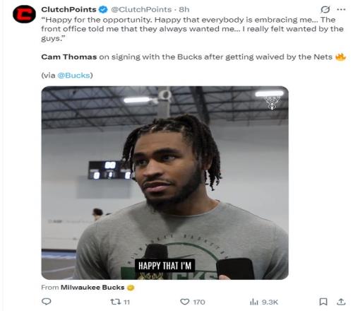 托馬斯在簽約雄鹿後接受采訪,他說道:很高興能有這個機會加盟雄鹿,也很高興大家接納了我,球隊管理層告訴我,他們一直都希望我能加入,我能感受到隊友們的認可。