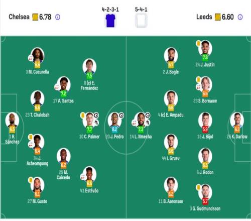 切爾西首發:1-桑切斯、27-古斯托、34-喬什·阿昌龐(79’29-福法納)、23-查洛巴、3-庫庫雷利亞(46’21-哈托)、25-凱塞多、17-桑托斯(79’9-德拉普)、10-帕爾默、8-恩佐、41-埃斯特旺(64’7-內托)、20-若昂·佩德羅。