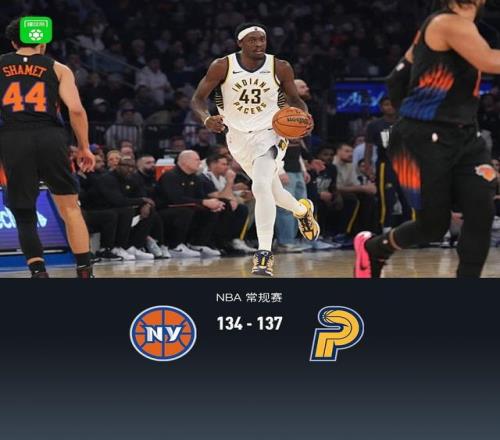 加時賽尼克斯布倫森拿下5分,步行者昆頓-傑克遜拿下7分,最終尼克斯134-137不敵步行者