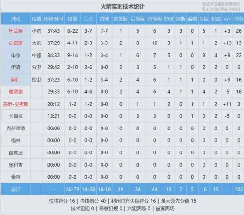 此役過後,火箭升至西部第三,落後第二的馬刺3個勝場。最後看看數據:
