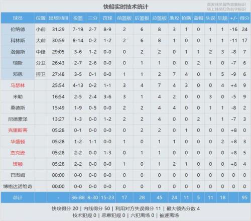 杜蘭特22中8得26分6板3斷5失誤,申京14中9拿到22分7板5助3失誤,謝潑德10中6拿到16分6板4助4失誤。倫納德19中7得24分8板3助1斷,連續32場砍下20+。馬瑟林13中4拿到9分7板4助3斷,手感一般,但是在場上活力十足。