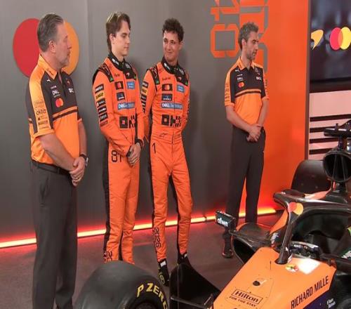 兩位車手,蘭多·諾裏斯與奧斯卡·皮亞斯特裏,以及車隊負責人安德裏亞·斯特拉與首席執行官紮克·布朗共同出席了發布會。