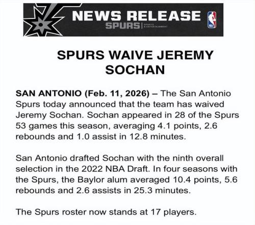 北京時間2月12日,聖安東尼奧馬刺隊官方宣布,球隊已裁掉傑裏米-索漢。本賽季,索漢代表馬刺出戰了53場比賽中的28場,場均登場12.8分鍾,得到4.1分、2.6個籃板和1.0次助攻。