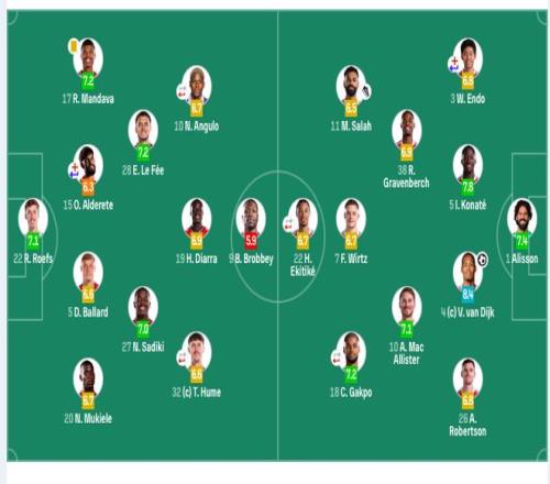 利物浦首發:1-阿利鬆、26-羅伯遜、4-範戴克、5-科納特、38-赫拉芬貝赫、3-遠藤航(69’2-戈麥斯)、10-麥卡利斯特、7-維爾茨、11-薩拉赫、18-加克波(75’17-瓊斯)、22-埃基蒂克(88’14-基耶薩)。