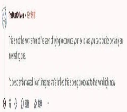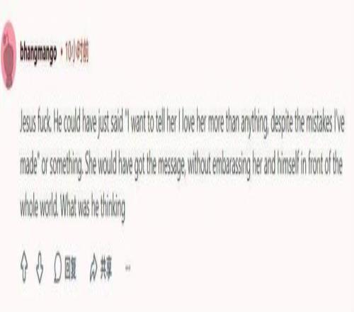 “他基本上是在說,希望通過這種公開出醜的行為讓她回心轉意。我希望她永遠不要再跟他說話了,這太荒謬了,對她來說也太丟臉了。”