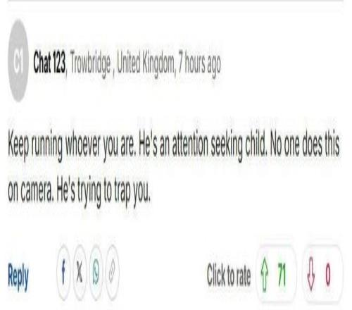 “姑娘,不管你是誰,趕緊跑。這就是個愛出風頭的小屁孩。沒人會在鏡頭前做這種事的,他就是在傷害你。”