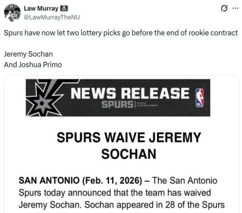 賽前馬刺官方宣布裁掉22年9號秀傑裏米-索漢,這是馬刺連續第二年裁掉樂透秀,上個賽季馬刺曾裁掉21年12號秀普裏莫,兩人都沒能執行完新秀合同。