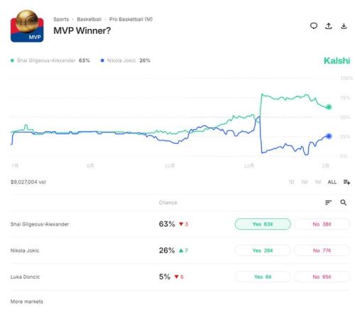 這場比賽後約基奇的MVP概率提升7%升至26%,而亞曆山大下滑63%還是第一,如果約基奇要跟SGA去競爭MVP,掘金餘下的27場比賽他需要出戰26場,因為聯盟的評獎規則是至少出戰65場比賽,約基奇再缺席一場就是最少的出戰場次65場。
