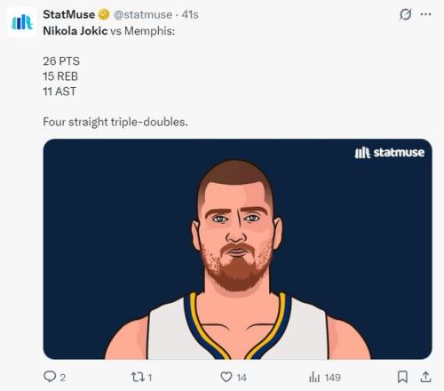 全場比賽約基奇34分鍾,17中8,罰球14中10,拿到26分15籃板11助攻2犯規9失誤,命中率47.1%,正負值+8,約基奇連續四場比賽完成三雙。