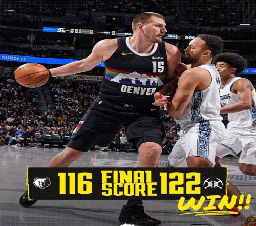 終場前53秒籃下勾手命中,隨後在終場前44秒防下了GG傑克遜的補籃,隨後波普絕平三分不中,穆雷反擊造犯規兩罰全中掘金領先5分,隨後比賽走向完結,約基奇雖然全場9次失誤可決勝時刻還是統治力超強。