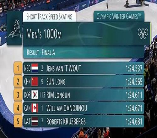 最後一圈,孫龍在最後一個彎道迸發出了巨大的能量!運用極其冒險且勇敢的方式在外道超越加拿大選手丹津諾來到第二,並且將這一位置保持到了最後!最終,他以0.028秒之差獲得短道速滑男子1000米亞軍,為中國短道速滑隊斬獲本屆冬奧會的首枚獎牌!
