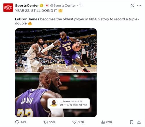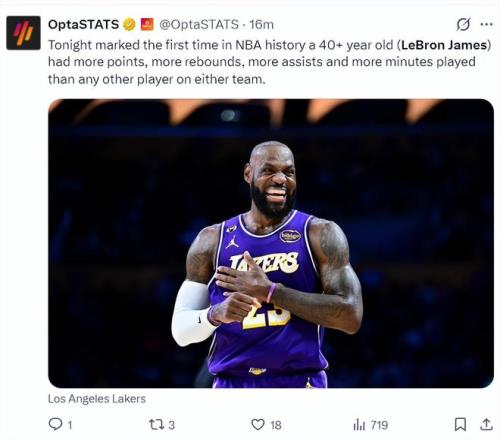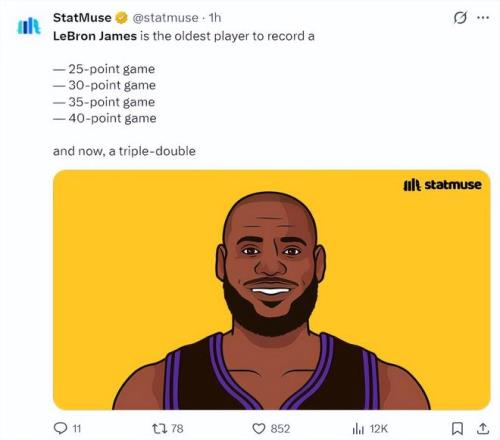 數據媒體Statmuse寫道:詹姆斯從最年長單場25+、單場30+、單場35+、單場40+到單場三雙。勒布朗-詹姆斯自最年輕的紀錄到最年長紀錄都統治了一個遍。
