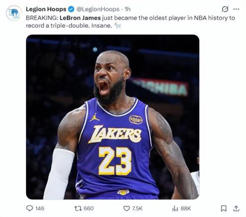 美媒LH寫道勒布朗成為曆史最年長的三雙球員,GOAT。