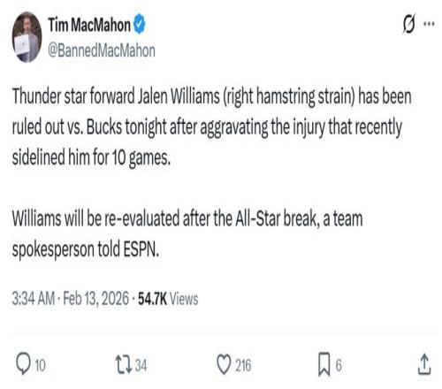 不僅核心亞曆山大持續缺陣,二當家傑倫威廉姆斯又遭遇右腿筋拉傷,此前他因為這一傷病連續缺席10場,突然複出對陣湖人後再度受傷,這樣的狀況不僅有可能影響雷霆隊常規賽階段競爭聯盟第一寶座,更是給季後賽衛冕之旅埋下不小的隱患。