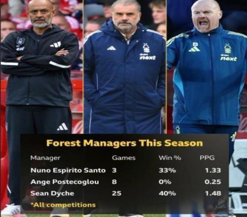 隻要看看本賽季諾丁漢森林這三位前任主帥的戰績,努諾執教3場,勝率33%,場均積1.33分,離隊原因與老板關係破裂;波斯特科格魯執教8場,戰績更是無法直視的2平6負勝率0%,場均積0.25分;肖恩戴奇執教25場,勝率40%,場均積1.48分,戴奇其實是這三人中成績最好的那個。 他40%的勝率甚至超過了曾經帶隊進歐戰的努諾(38.36%)。如果隻計算戴奇上任後的積分,森林甚至能排在積分榜中遊。但他還是下課了。