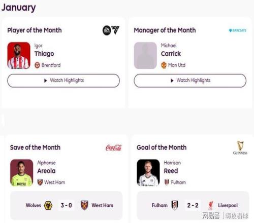 整個1月,曼聯有5場比賽,分別由阿莫林、弗萊徹和卡裏克三人帶隊,卡裏克僅用其中2場就獲得最佳,實在難以置信。同樣是新帥的羅塞尼爾贏下3場落選。值得一提的,落選的伊勞拉,在過去6場聯賽中,帶領伯恩茅斯,取得跟曼聯均為4勝2平的成績,是英超得分最高的兩隊。
