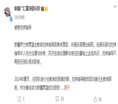 新疆伊力特男籃主教練劉煒指導因身體原因,向俱樂部提出辭職。經俱樂部與劉煒指導本人充分溝通與協商,雙方在彼此理解與信任的基礎上達成共識,劉煒指導不再擔任球隊相關職務。
