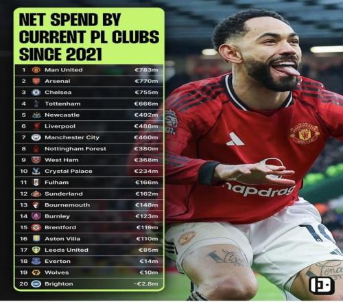 淨支出7.83億歐元,最高第3。淨支出是全名單最高,但名次上限沒有相應站到第1/第2的層級,投入與聯賽回報的匹配度最差,合理性最難成立。