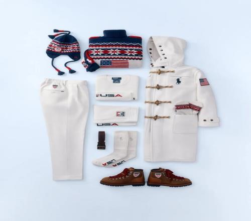 開幕式製服采用冬季白色係羊毛大衣,搭配繡有美國國旗圖案的針織毛衣、對比色細節與優雅剪裁,整體呈現出一種「優雅複古滑雪風」。