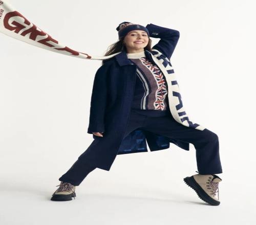 Adidas 負責競技裝備與功能結構,將英國國旗 Union Jack 圖案進行結構性解構,使其融入冬季運動服廓形之中,而非簡單的平麵印花。色塊拚接與幾何切割讓視覺更具速度感,也強化了競技氛圍。