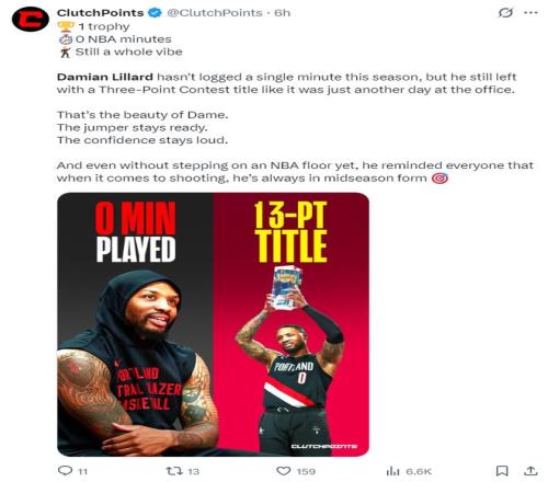 除此之外利拉德還創造了一項NBA曆史首人紀錄,他在本賽季還未出戰過任何一分鍾,卻拿到了三分大賽的冠軍,他是曆史首位做到的NBA球員。