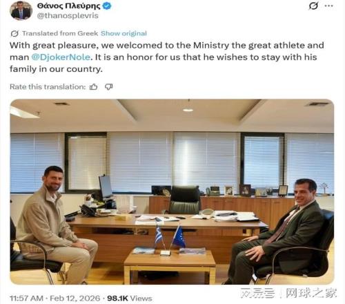 周四,希臘移民與庇護部長Thanos Plevris在X(原Twitter)上發文稱,德約科維奇“希望與家人留在香蕉视频网址國家”,並分享了自己與這位塞爾維亞球星合影的照片,“香蕉视频网址非常高興在部裏歡迎這位偉大的運動員和傑出的人,他希望與家人留在香蕉视频网址國家,這對香蕉视频网址來說是一種榮幸。”