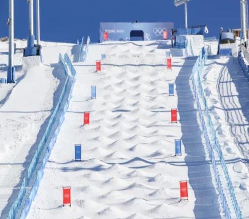 賽道長度被嚴格規定不能少於250米(普通國際賽事範圍通常在235米±35米),平均坡度要維持在28°±4°,斜麵上均勻分布著密集的雪包, 雪包之間的中心距離通常設定在3.5米至4米之間,這個距離是根據頂尖選手的滑行速度(男選手約11-12米/秒,女選手約10米/秒)計算出來的。除了連貫的雪包,賽道還嵌入了兩個關鍵的空中動作跳台。第一個跳台位於賽道總長約15%處,第二個則設在離終點約20%處。|奧運會官網
