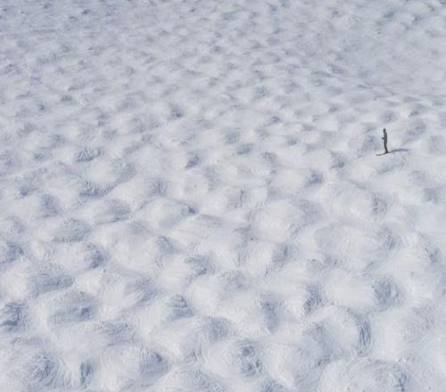 高級雪道地形複雜,坡度較大,通常沒有壓雪車專門整理,隻要一場大雪遇上一群人,規律便產生了:大家習慣在相似的位置轉彎,雪板則不斷將積雪推向外側。隨著時間的推移,小雪包匯聚隆起成小山丘,最終在坡麵上刻畫出凹凸相間的槽狀地形。在漫長的冬季裏,蘑菇經曆著日複一日的自然演變——夜晚凍結定型,午後被陽光曬軟,或是被新雪覆蓋後由後來者重新“雕琢”。如果不加人工幹預和整理,整座雪山最終都會被這股力量占領。