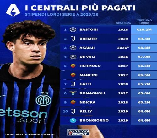 北京時間2月17日,德轉統計出了2025-26賽季意甲稅前工資最高10名中後衛,巴斯托尼以1020萬歐元高居第一,布雷默930萬歐元第二,阿坎吉880萬歐元第三。