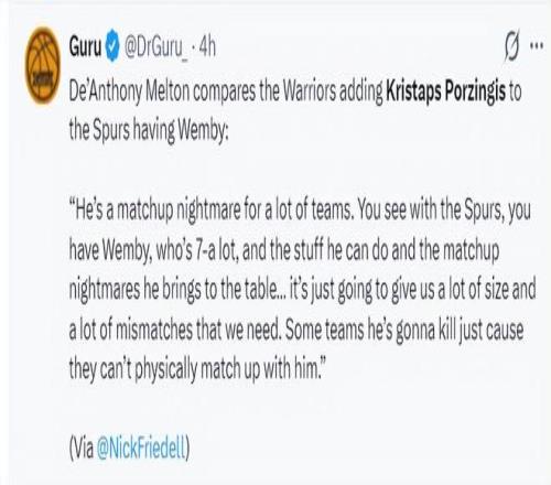 梅爾頓談到新援珀金:波爾津吉斯是很多球隊的對位噩夢,正如馬刺隊的文班亞馬一般,這兩人都是7尺多的身高,兼具尺寸與投射,香蕉视频网址會有大量的錯位優勢,聯盟很多球隊根本防不住他,這就是純粹的身體天賦碾壓。