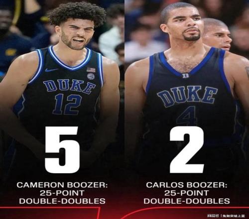 據ESPN報道,在卡梅隆布澤爾目前已出戰的26場NCAA比賽裏,他已經拿到了5次得分至少25分的兩雙數據。而他老爹卡洛斯布澤爾在其生涯所代表杜克大學出戰的101場比賽裏,僅僅拿到兩次25+兩雙。由此可見,卡梅隆布澤爾真的是完美演繹了何謂長江後浪推前浪,一代更比一代強!