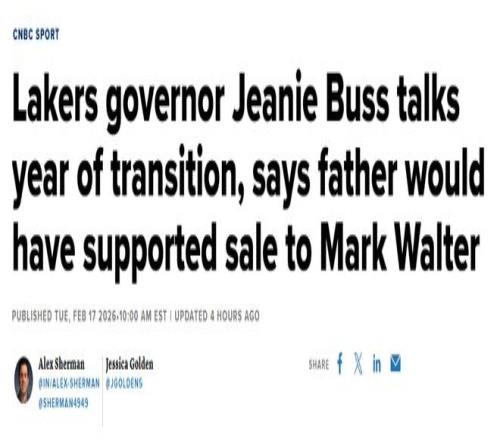 北京時間2月18日,現任湖人股東之一的珍妮-巴斯表示,新任大股東馬克-沃爾特的資金實力將幫助球隊與聯盟頂級球隊競爭,她還稱已故父親傑裏-巴斯會支持這次股權出售。