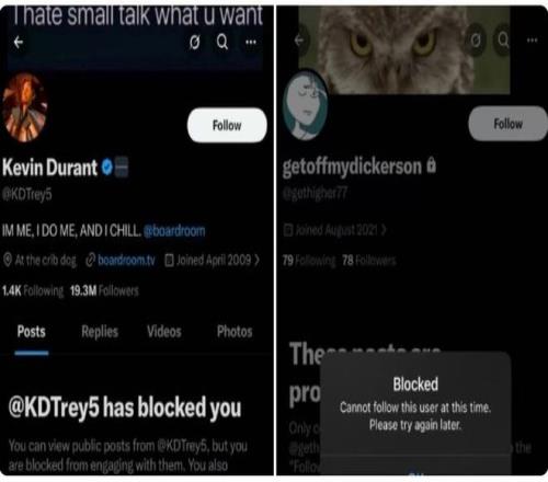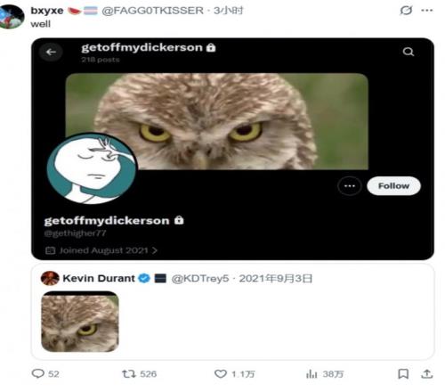 除此之外,杜蘭特的大號將這個小號拉黑了,而這個他不認識的疑似小號也將他拉黑了,所以他確定這個賬號就是屬於杜蘭特。並且,該賬號的資料背景圖片,也曾在杜蘭特的大號裏出現過(下圖的貓頭鷹):