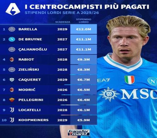 北京時間2月20日,德轉統計出了本賽季意甲稅前年薪最高的10名中場球員,巴雷拉以1200萬歐元排名第一,德布勞內和恰爾汗奧盧同以1110萬歐元並列第二位。