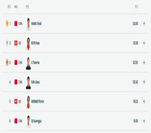 好在最後有驚無險,四位中國選手都進入了決賽第二輪。瑞士隊的羅特、維爾納分別以131.56分和127.50分排在決賽第一輪的前兩名。這樣形成了四名中國運動員,兩名瑞士運動員爭奪該項目金牌的局麵。