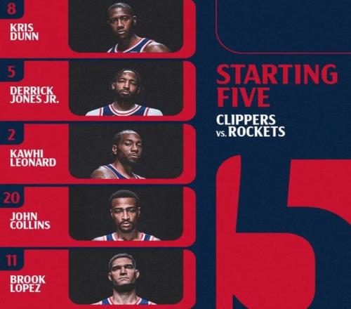 首發陣容方麵,湖人隊這邊,全員健康,雷迪克教練排出的首發五人組為:馬庫斯-斯馬特、勒布朗-詹姆斯、德安德烈-艾頓、奧斯汀-裏夫斯、盧卡-東契奇;快船這邊,比爾(左臀骨折)賽季報銷、新援加蘭(右腳扭傷)歸期未定、博格丹諾維奇也因傷缺陣,首發陣容則為:科懷-倫納德、約翰-科林斯、布魯克-洛佩斯、德裏克-瓊斯、克裏斯-鄧恩。