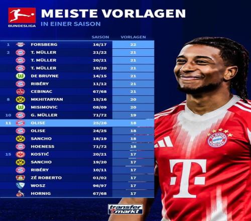按照德轉的統計,奧利塞本賽季德甲出場21次送出18次助攻,這一數據已經能夠排在德甲曆史單賽季助攻榜的並列第11位,目前這位法國球星距離福斯貝裏保持的德甲單賽季22次助攻的紀錄還差4次,在本賽季德甲還剩餘12輪比賽的情況下,奧利塞很有希望打破這一紀錄。