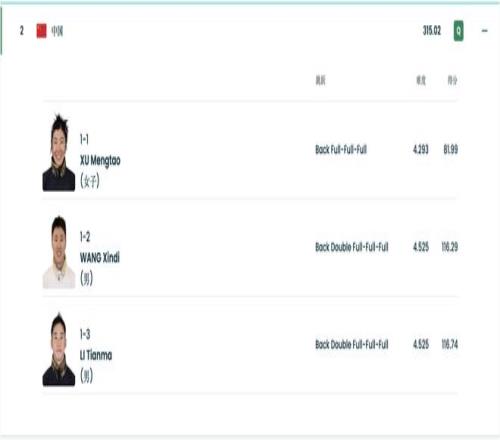 兩跳過後,中國隊總分暫列第三位。最後一跳,小將李天馬登場,同樣高質量完成了“Back Double Full-Full-Full”動作,拿到了116.74分,從而幫助中國隊以總分315.02分反超澳大利亞來到第二,作為四個成績最好的隊伍挺進第二輪決賽。